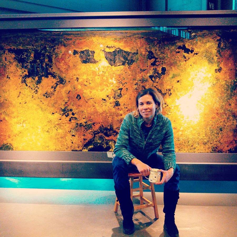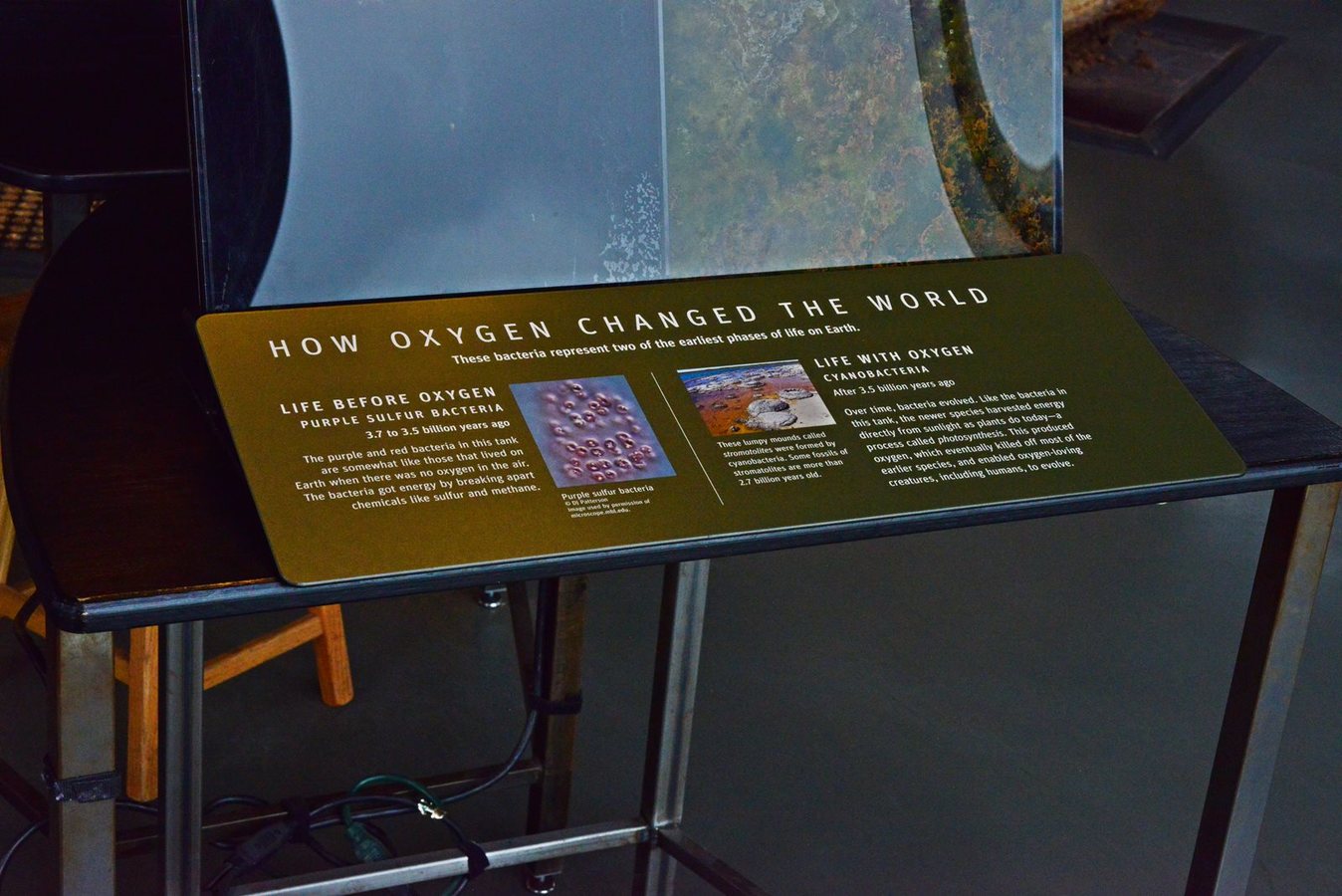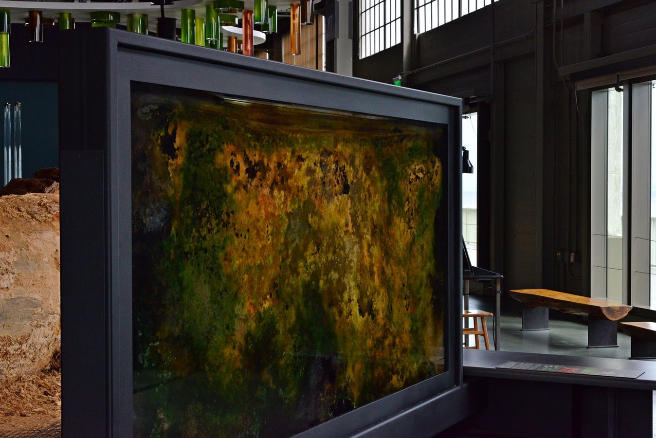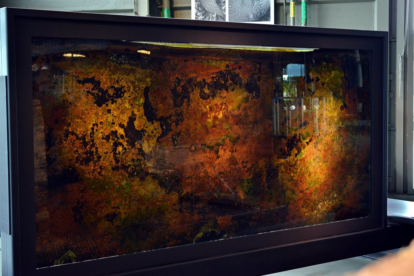 The panels are made by filling thin acrylic tanks with mud from a pond. Some nutrients like iron, cellulose and sulfur are added to the mud and then the panels are illuminated with artificial light; preferably incandescent light like metal halides. The bacteria, which are already present in the mud in low numbers, begin to reproduce. This set up is based on a Winogradsky column. The Ukranian microbiologist Sergei Winogradsky pioneered the study of microbial ecology by growing many different types of bacteria together in the same vessel in the lab.