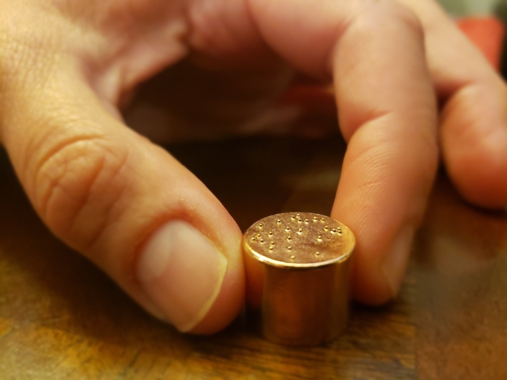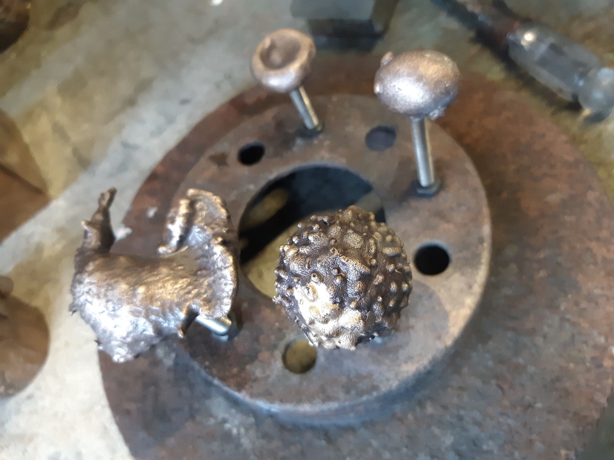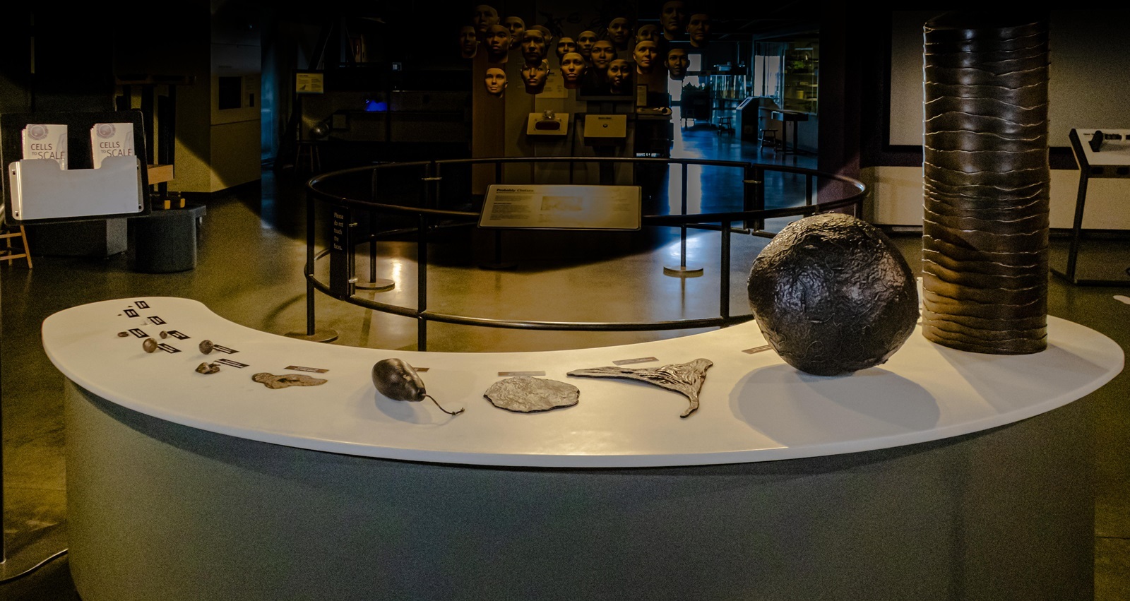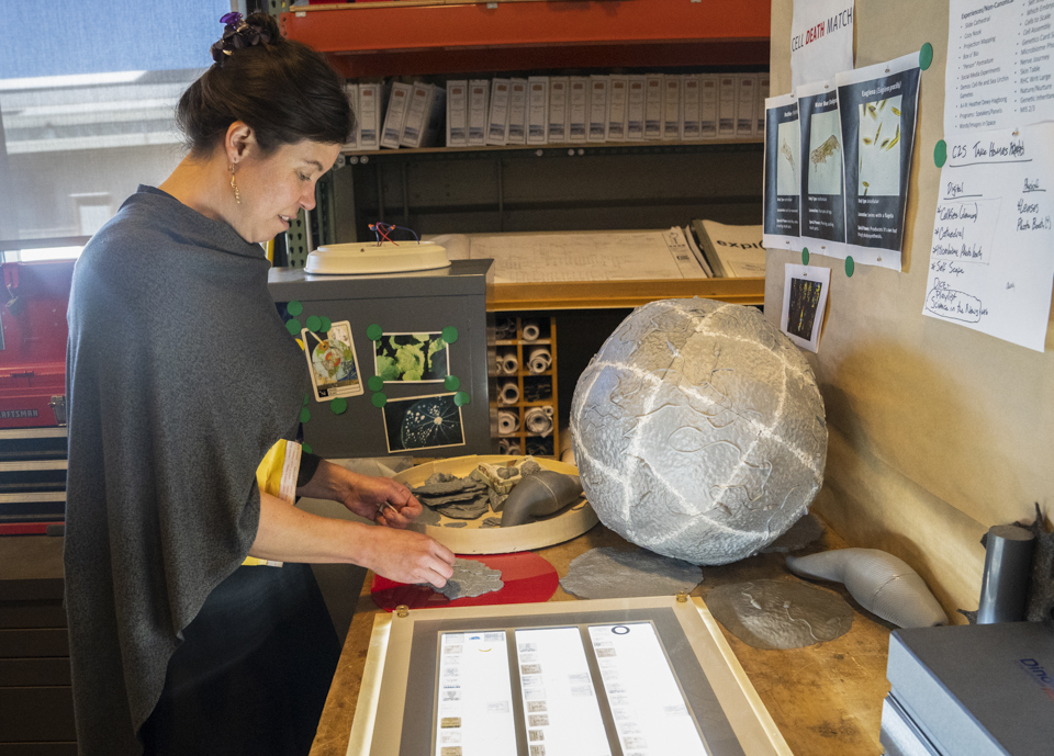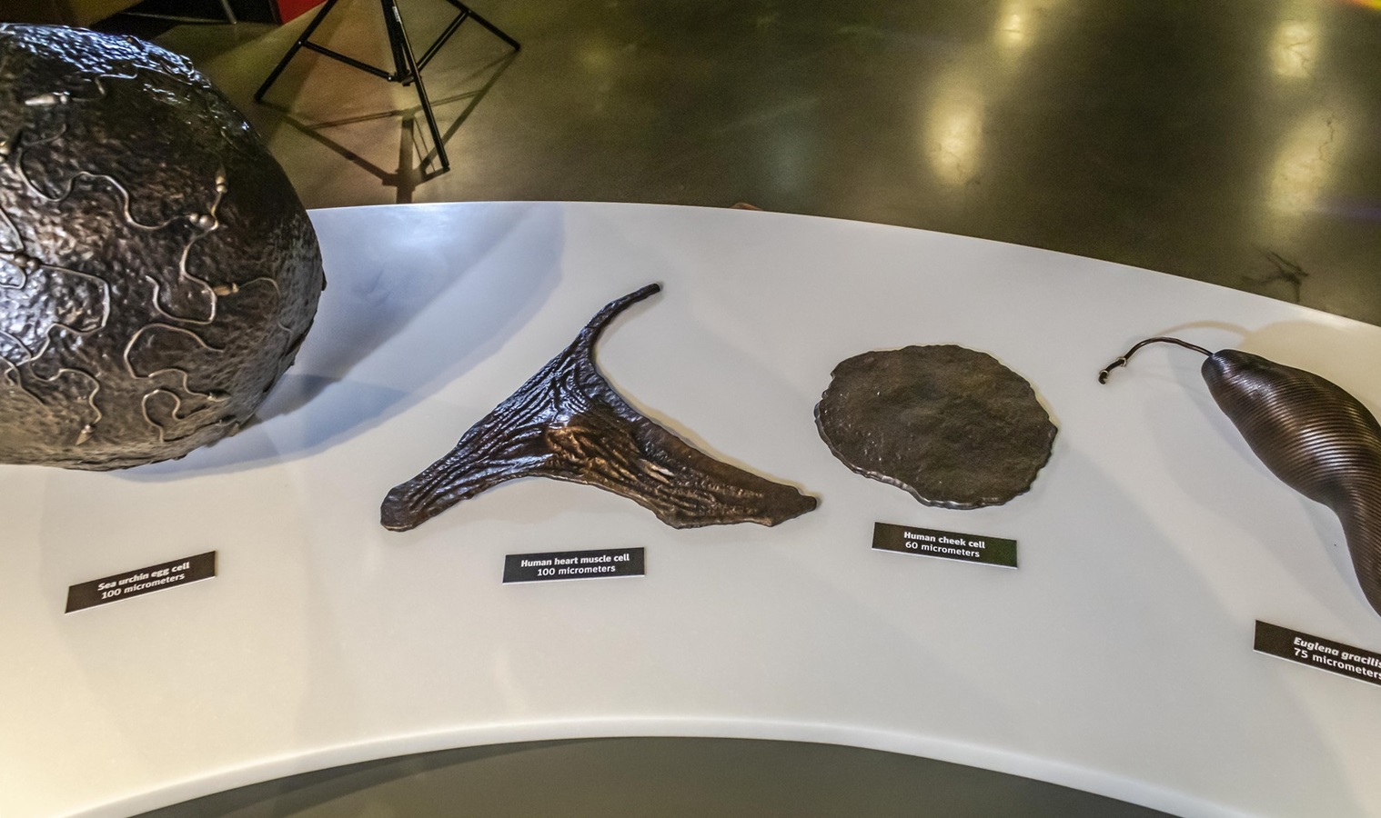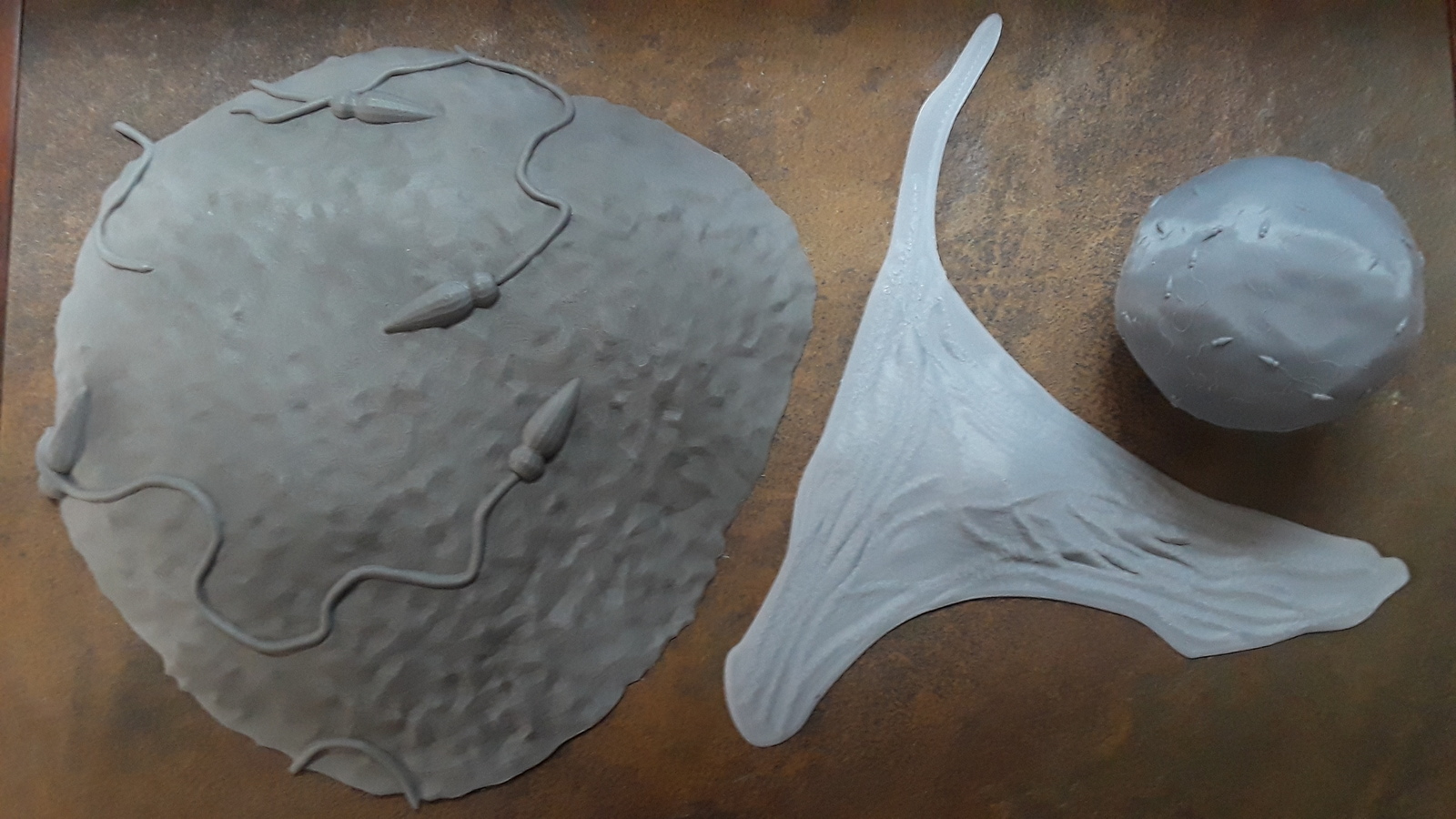 Pictured is our process of creating custom cell bronzes. Each virus particle and cell is modeled from reference images and then 3D printed at 4000 times real size. Wax 3D prints are used for lost wax bronze casting.